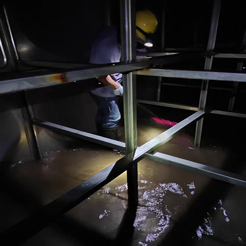 清洗过程:1、安排清洗人员。为了防止工作人员携带病菌进入槽内,应使工作人员穿干净衣服,所使用的长靴.手套和雨衣等应以有效氯为50~100ppm的消毒液消毒。